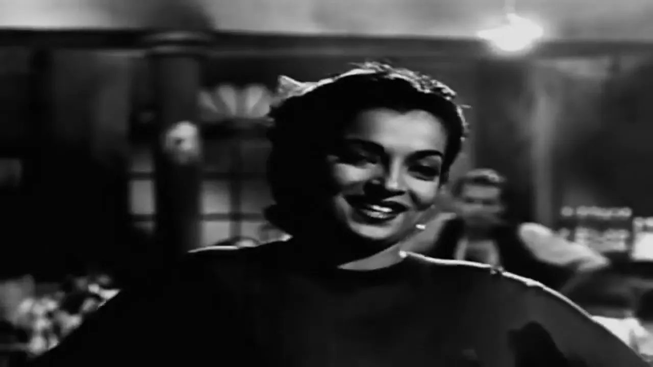 singer (Sheila Ramani) on seeing the two men (Devanand and the vilain)