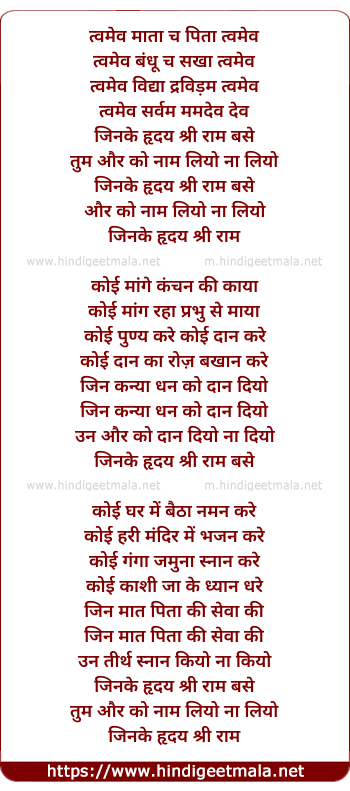 Lyrics of Jinke Hriday Shri Ram Base - त्वमेव माता च पिता त्वमेव