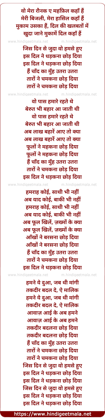 Lyrics of Jis Din Se Juda Woh Hamase Huye - वो मेरा रौनक ए महफ़िल कहाँ हैं