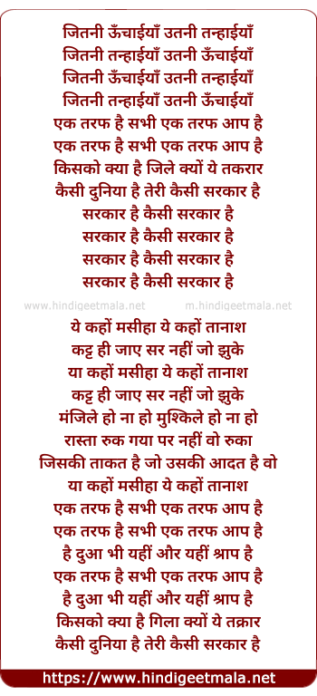Lyrics of Jitni Oonchaiyya Utni Tanhaiyya - जितनी ऊँचाईयाँ उतनी तन्हाईयाँ