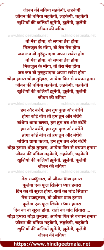 Lyrics of Jivan Kee Bagiya Mahakegee Lahakegee Chahakegee - जीवन की बगिया महकेगी, लहकेगी चहकेगी