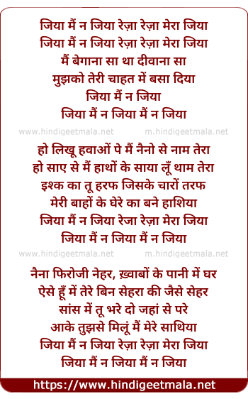 Lyrics of Jiya Main Na Jiya, Reza Reza Mera Jiya - जिया मैं न जिया रेज़ा रेज़ा मेरा जिया