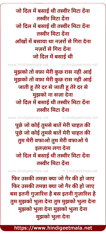 Lyrics of Jo Dil Me Basai Thi Tasvir Mita Dena - जो दिल में बसाई थी तस्वीर मिटा देंना