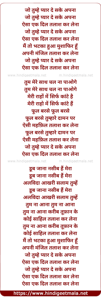 Lyrics of Jo Tumhe Pyar De Sake Apna - जो तुम्हे प्यार दे सके अपना