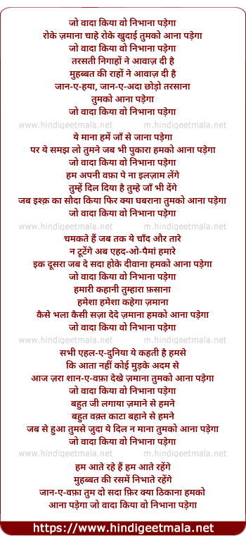 Lyrics of Jo Wada Kiya Wo Nibhana Padega - जो वादा किया वो निभाना पड़ेगा