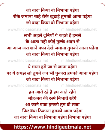 Lyrics of Jo Wada Kiya Wo Nibhana Padega (Sad) - जो वादा किया वो निभाना पड़ेगा