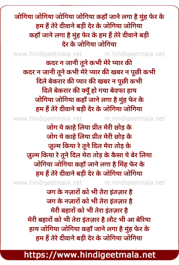 Lyrics of Jogiya Jogiya Kaha Jane Laga Hai Muh Fer Ke - जोगिया जोगिया कहाँ जाने लगा है मुंह फेर के