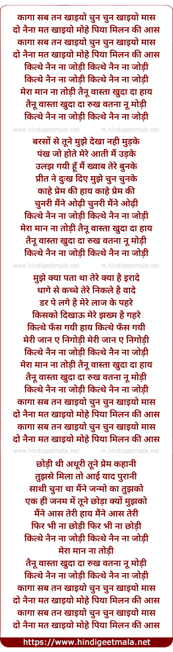 Lyrics of Kaaga Sab Tan Khaaiyo - कागा सब तन खाइयो