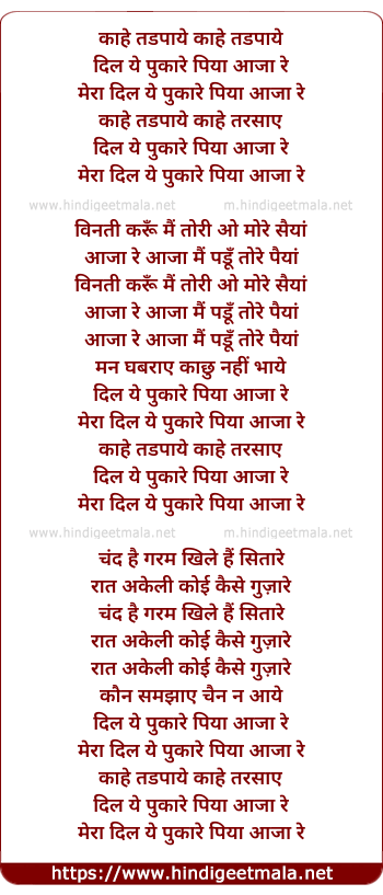 Lyrics of Kaahe Tadpaye Kaahe Tarsaaye - काहे तड़पाये काहे तरसाये