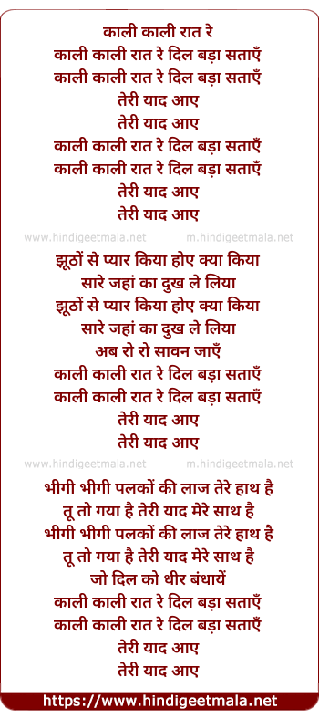 Lyrics of Kaalee Kaalee Raat Re Dil Bada Sataaye - काली काली रात रे दिल बड़ा सताए