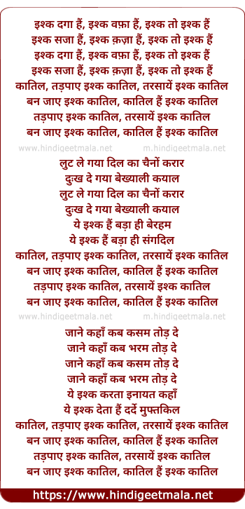 Lyrics of Kaatil Tadpaaye Ishk Kaatil - कातिल तड़पाये इश्क कातिल
