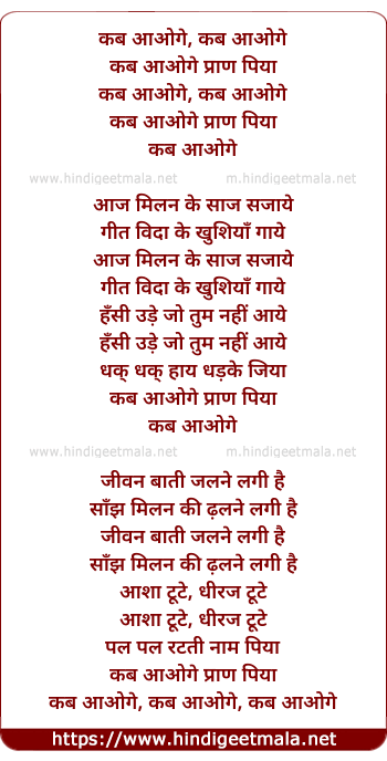 Lyrics of Kab Aaoge Pran Piya - कब आओगे प्राण पिया