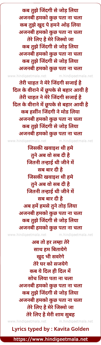 pata na chala kab tujhe zindagi se jod liya, ajnabi humko kuchh pata na