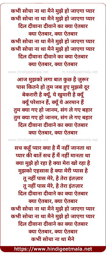 Lyrics of Kabhee Socha Naa Tha Maine - कभी सोचा ना था मैने