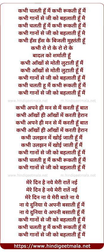 Lyrics of Kabhi Chalti Hu Mai - कभी चलती हूँ मैं कभी रूकती हूँ मैं