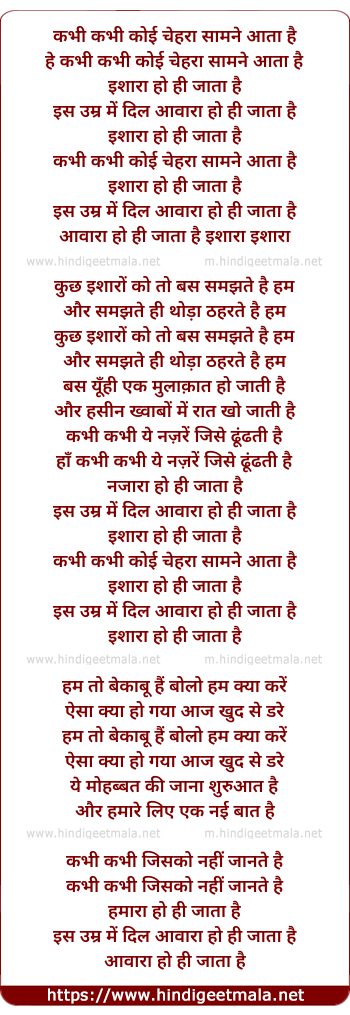 Lyrics of Kabhi Kabhi Koi Chehraa - कभी कभी कोई चेहरा