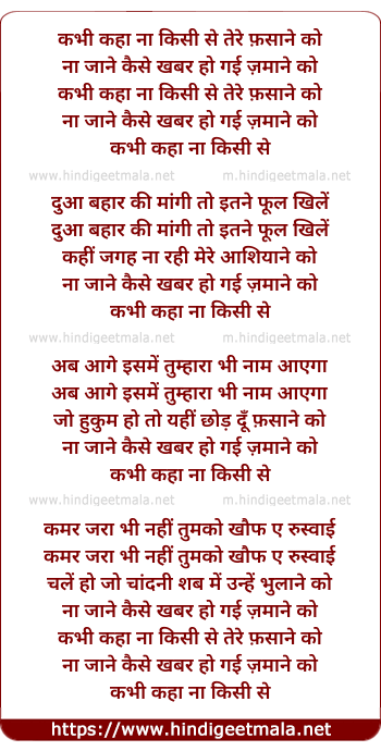 Lyrics of Kabhi Kaha Na Kisise - कभी कहा ना किसी से तेरे फ़साने को