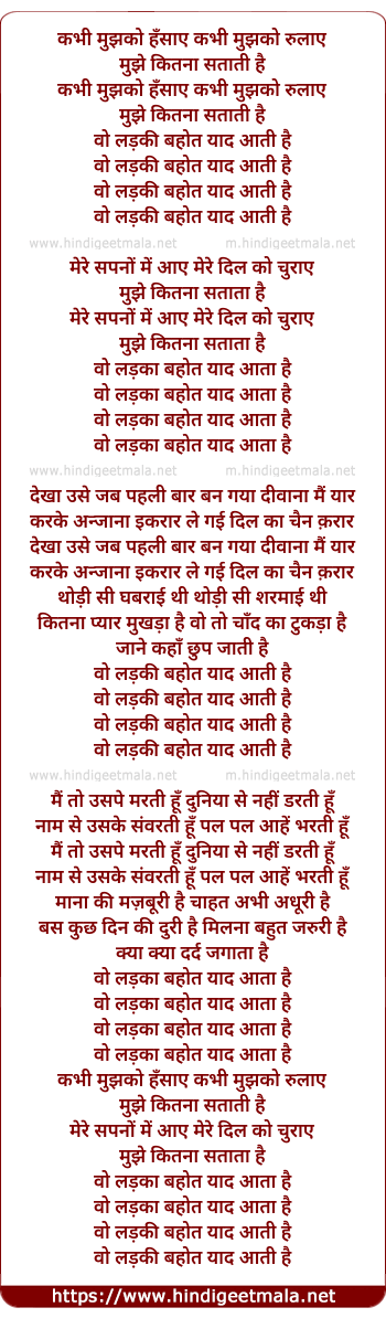 Lyrics of Kabhi Mujhako Hansaae, Vo Ladaki Bahot Yaad Aati Hai - कभी मुझको हँसाए, वो लड़की बहोत याद आती है