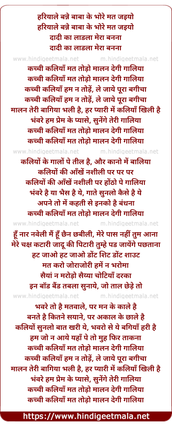 Lyrics of Kachchi Kaliyaan Mat Todo - कच्ची कलियाँ मत तोड़ो