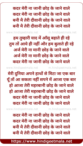 Lyrics of Kadar Meri Na Jani Chhod Ke Jane Wale - कदर मेरी ना जानी छोड़ के जाने वाले