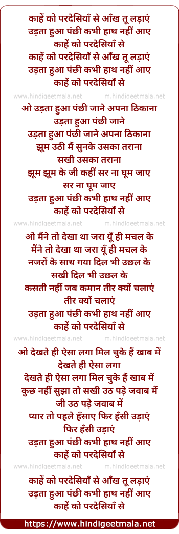 Lyrics of Kahe Ko Pardesiya Se Ankh Tu Ladaye - काहें को परदेसियाँ से आँख तू लड़ाएं