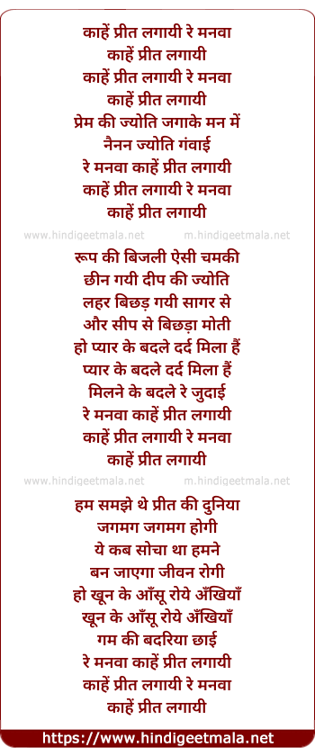 Lyrics of Kahe Preet Lagayi Re Manva - काहें प्रीत लगायी रे मनवा