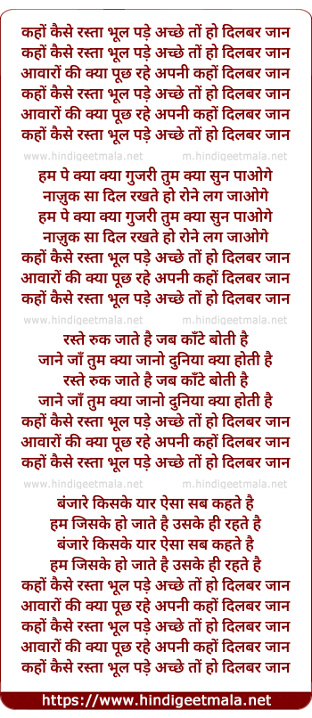 Lyrics of Kaho Kaise Rasta Bhool Pade Achchhe Toh Ho Dilbaar Jaan - कहों कैसे रस्ता भूल पड़े अच्छे तों हो दिलबर जान