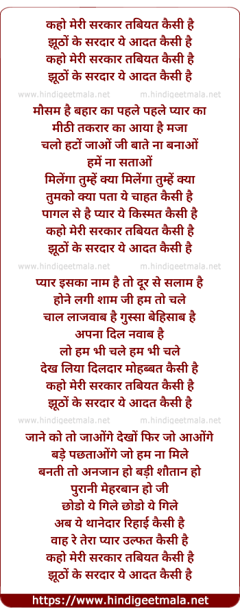 Lyrics of Kaho Meri Sarkar Tabiyat Kaisi Hai - कहो मेरी सरकार तबियत कैसी है