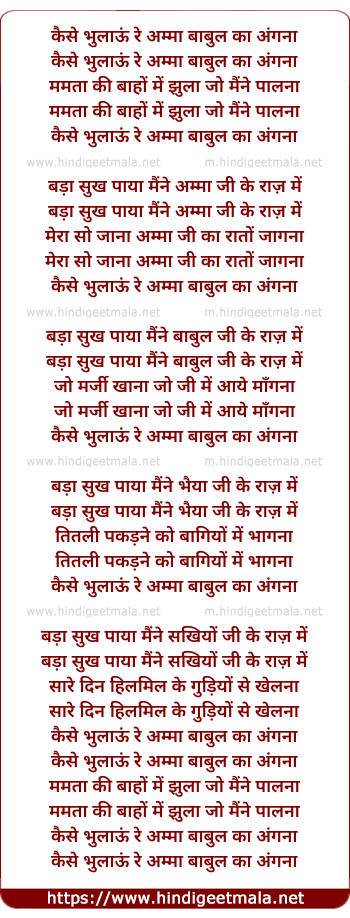 Lyrics of Kaise Bhulaao Re Amma Babul Ka Aangna - कैसे भुलाऊं रे अम्मा बाबुल का अंगना