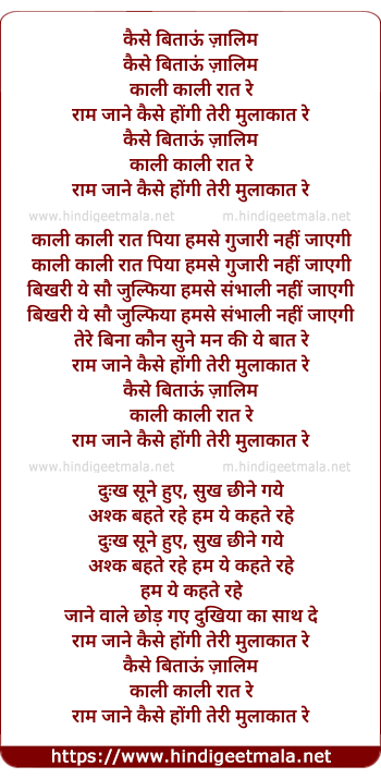 Lyrics of Kaise Bitau Zalim Kali Kali Rat Re - कैसे बिताऊं ज़ालिम काली काली रात रे