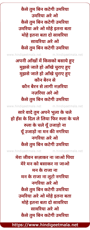 Lyrics of Kaise Tum Bin Kategi Umariya - कैसे तुम बिन कटेगी उमरिया
