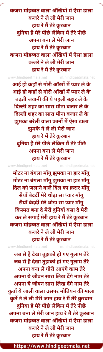 Lyrics of Kajaraa Muhabbat Vaalaa, Ankhiyon Men Aisaa Daalaa - कजरा मोहब्बत वाला अँखियों में ऐसा डाला