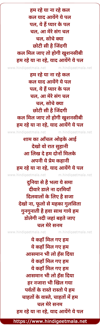Lyrics of Kal Yaad Aayenge Ye Pal - हम रहे या ना रहे कल