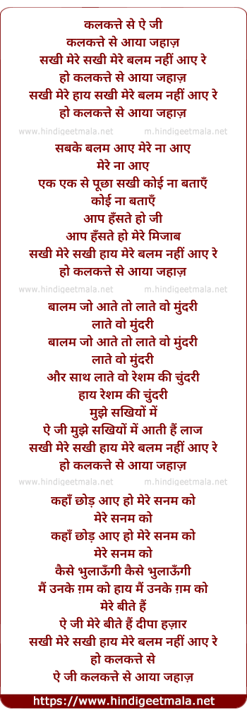 Lyrics of Kalkatte Se Aaya Jahaz - कलकत्ते से आया जहाज़