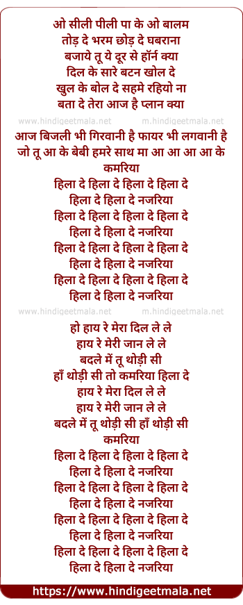 Lyrics of Kamariya Hila Re Hila Re - कमरिया हिला रे हिला रे