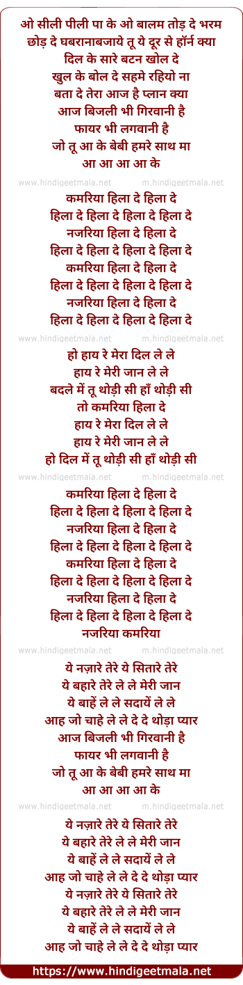 Lyrics of Kamariya Hila Re Hila Re - कमरिया हिला रे हिला रे