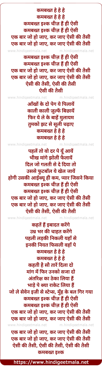 Lyrics of Kambakht Ishq Cheez Hai Hi Aisi - कमबख्त इश्क चीज़ हैं ही ऐसी