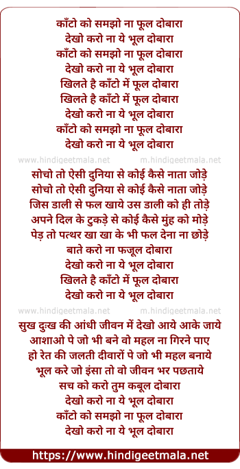 Lyrics of Kanto Ko Samjho Na Phul Dobara - काँटो को समझो ना फूल दोबारा