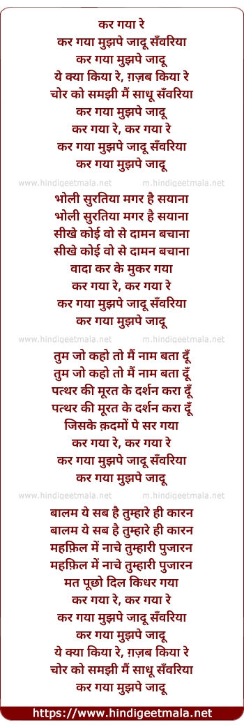 Lyrics of Kar Gaya Re Kar Gaya Mujhpe Jadu - कर गया रे कर गया मुझपे जादू