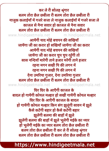 Lyrics of Kar Le Ri Solah Singar Balam Tora Chail Chabila Ri - कर ले री सोलह श्रृंगार बलम तोरा छैल छबीला री