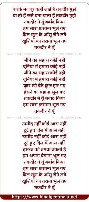 Lyrics of Karke Majbur Kahan Laayi Hai Taqdir - करके मजबूर कहाँ लाई हैं तकदीर