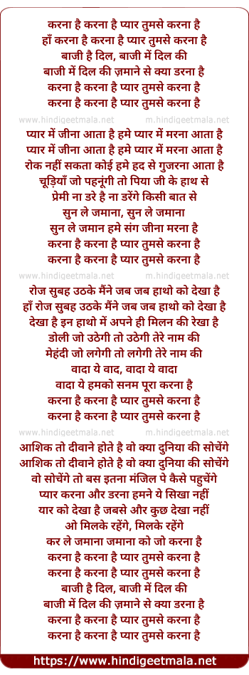 Lyrics of Karna Hai Karna Hai Pyar Tumse Karna Hai - करना है करना है प्यार तुमसे करना है