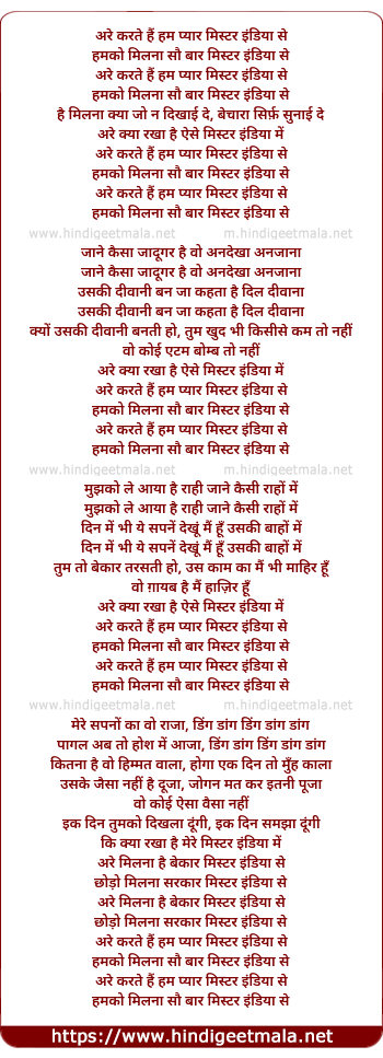 Lyrics of Karte Hai Ham Pyar Mr. India Se - करते हैं हम प्यार मिस्टर इंडिया से
