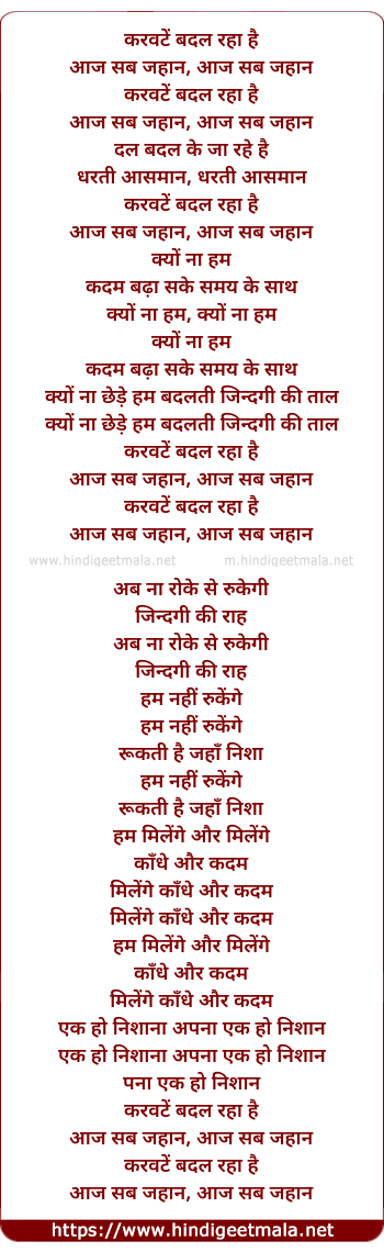 Lyrics of Karvate Badal Raha Hai Aaj Sab Jahan - करवटें बदल रहा है आज सब जहान