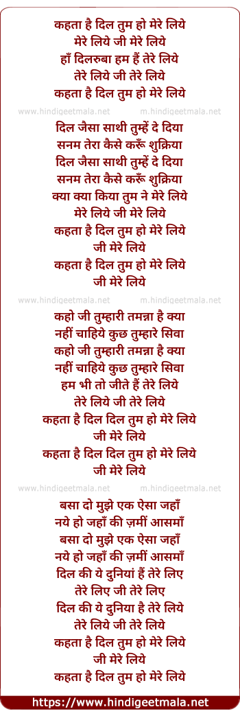 Lyrics of Kehta Hai Dil Tum Ho Mere Liye - कहता है दिल तुम हो मेरे लिये