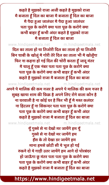 Lyrics of Kehte Hai Mujuko Raja, Mai Bajata Hu Dil Ka Baaja - कहते है मुझको राजा ,मै बजाता हू दिल का बाजा