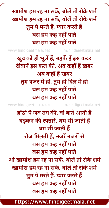 Lyrics of Khaamosh Hum Rah Na Sake, Bole Toh Roke Sharm - खामोश हम रह ना सकें, बोलें तो रोके शर्म