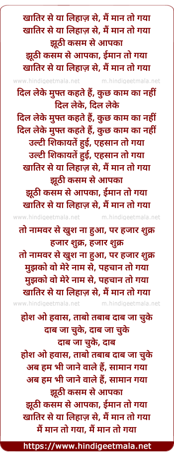 Lyrics of Khaatir Se Ya Lihaaz Se - खातिर से या लिहाज़ से, मैं मान तो गया