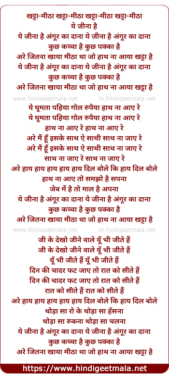 Lyrics of Khatta Mitha Ye Jina Hai Angur Ka Dana - खट्टा मीठा ये जीना है अंगूर का दाना