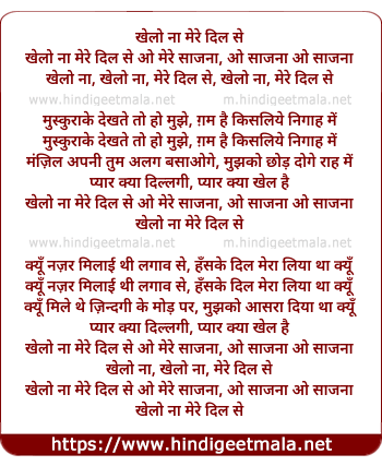 Lyrics of Khelo Naa Mere Dil Se O Mere Saajanaa - खेलो ना मेरे दिल से ओ मेरे साजना, ओ साजना ओ साजना